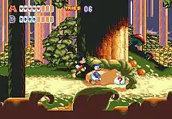 Players can either play solo as either Mickey Mouse or Donald Duck, or co-operatively with two players controlling Mickey and Donald while sharing from the same pool of tries. Mickey and Donald can run, jump, or attack by flourishing their capes. Enemies defeated in this way turn into doves, cards, or other harmless objects depending on the enemy. After defeating the boss of each level, a new magic spell is learned, allowing the pair to traverse the next level, i.e. flying on a magic carpet or going underwater in an air bubble. The gameplay changes significantly depending on the characters chosen. For example, Mickey can squeeze through certain gaps, while Donald must find a different route, leading him to entirely different realms. When playing in two-player mode, the players can stand on each other's shoulders and use ropes to help each other out, and Mickey can pull Donald through gaps his (evidently very stiff) tail feathers prevent him from fitting through.