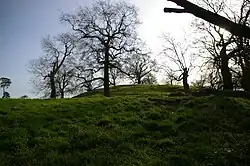 The castle was probably built by Hermer de Ferrers after the Norman Conquest, and remained in the de Ferrers family until 1166.[1] The motte is 5 metres high and 77 metres by 62 metres wide at the base.[2] The motte is surrounded on three sides by a ditch up to 15 metres wide and 2 metres deep.[2] The bailey is 150 metres by 88 metres across, and raised about 1 metre from the ground.[2] The castle would have been highly visible in early medieval times, more so than in the 21st century, and would have formed a local landmark as well as controlling the local causeway across the Fens.[3] Wormegay formed the centre, or the caput, for an honour of feudal properties across East Anglia.[4] As the centre of a major estate, Wormegay provided castle-guard duties to Norwich Castle.[5]