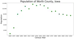 Worth County is a county located in the U.S. state of Iowa. As of the 2020 census, the population was 7,443.[1] The county seat is Northwood.[2] The county was founded in 1851 and named for Major General William Jenkins Worth (1794–1849), an officer in both the Seminole War and the Mexican–American War.
