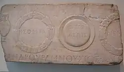 As can be inferred from Apuleius's The Golden Ass and Aristophanes's Plutus, to wear a wreath was a sign of distinction, and an assault on a wreath's wearer was considered especially blameworthy.[1][2][3] According to Tertullian's De corona, the wearing of wreaths was an ancient practice.[1][4] Indeed, it was rare for religious rites and cult practices to omit the wearing of wreaths.[5] Priests wore wreaths for the performance of sacrifices, as did other participants in the ceremony and the sacrificial victim.[1] Similarly, altars, statues, and religious buildings and accoutrements could all be wreathed.[1] Wreaths were sacred objects, and removing one and disposing of it could not be done casually or without due reverence, neither could an unauthorized person wear one without committing sacrilege.[1][6][7]