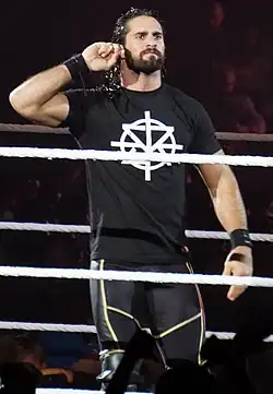 In 2014, The Shield (Seth Rollins, Dean Ambrose, and Roman Reigns) were involved in a rivalry with Evolution (Triple H, Randy Orton, and Batista). After multiple losses to The Shield and Batista quitting WWE, Triple H recruited Rollins to The Authority.[64] Rollins was the forefront of The Authority and won the WWE World Heavyweight Championship (later renamed WWE Championship) at WrestleMania 31, but was forced to vacate the title in November 2015 due to injury.[65][66] He returned in mid-2016, and during a fatal four-way for the vacant WWE Universal Championship, Triple H aided Rollins in eliminating Reigns, but then turned on Rollins by attacking him with a Pedigree, costing Rollins the match.[67] During the first months of 2017, Rollins started a rivalry with Triple H, asking for answers. At NXT TakeOver: San Antonio, Rollins appeared and challenged Triple H to a match, who had Rollins escorted from the building by security.[68] On the January 30 episode of Raw, as Rollins was about to confront Triple H, Samoa Joe attacked Rollins,[59] re-injuring his knee.[69] Rollins was estimated to be out of action for up to eight weeks,[70] but after an attack from Triple H,[62] Rollins signed a contract for a non-sanctioned match with Triple H at WrestleMania 33, which forbid Rollins from suing WWE if he were to get injured again.[71]