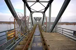Construction of the railway bridge over the Oder started in 1890. The construction project consisted of two bridges and a causeway in between. Since there were no other bridges in the vicinity, it was built so that it could also be used as a road bridge. In 1910, the bridges were raised by 1.60 metres and the bridges bearings are reinforced to allow heavier trains to operate and larger boats to sail under it.[4] In 1930, a new bridge was built next to the old bridge for the railway. The old bridge was now used only as a road bridge.[5]