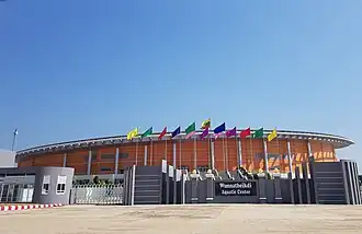 Wunna Theikdi Aquatic Center is an aquatic center located inside Wunna Theikdi Sports Complex in Naypyidaw.It was built to host the 27th SEA Games. Construction began in 2011 and completed in 2013. It features one swimming pool (50 meter), diving pool and outdoor pool. It can accommodate around 3,000 spectators.[1][2] The only international standard indoor swimming pools in Myanmar is this one and the Zeyar Thiri Aquatic Center from the military-owned Zeyar Thiri Sports Complex.[3]