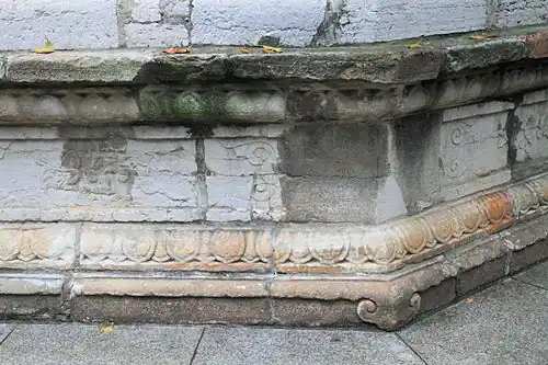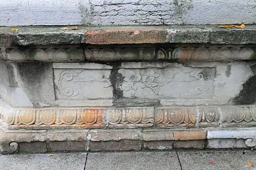 The original pagoda having been destroyed at some earlier time, it was rebuilt in 1270 (咸淳六年) in the throes of the overthrow of the Southern Song during the reign of Emperor Duzong.[4] The pagoda bears inscriptions dating from the period.[2] The pagoda was designed to incorporate Buddhist iconography through various symbolic features and figures[5] including images of Buddha, bodhisattvas, heavenly kings and celestial guards. While of solid stone construction, it is modeled upon multi-storeyed wooden pagodas.[2] Some of the original artistry has been damaged.