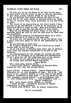 "Will of Henry Wyche of Brunswick County.. The land I now live on being in two surveys containing 590 acres to my son Henry Wyche, excepting that my loving wife Frances is to have the use of the plantation during her widowhood.."