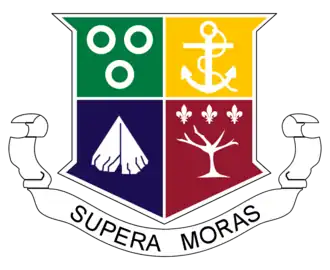 The shield was quartered. In the first quarter were three golden rings on a red background (the arms of Jan van Riebeeck). In the second quarter was a black anchor on a golden background, representing the Cape Colony. The third quarter was black, showing a white tent with a pennant flying (to represent the military garrison). The fourth quarter depicted a golden vine and three fleurs de lis against a green background.[18] The motto was Vivit crescat floreat vitis.