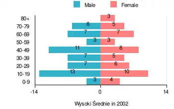 According to the 2002 Poland census, there were 108 people residing in Wysoki Średnie village, of whom 52.8% were male and 47.2% were female. In the village, the population was spread out, with 20.4% under the age of 18, 42.6% from 18 to 44, 13.9% from 45 to 64, and 23.1% who were 65 years of age or older.[1]