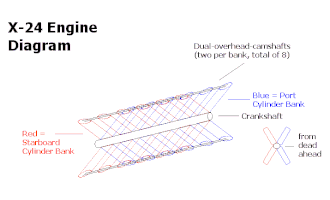 The X-24 is one of the few configurations of X-type engines known to have been produced. The design consists of four banks of six cylinders with a common crankshaft. This is lighter than other multi-bank designs, which require multiple crankshafts. Few of the X-24 engines developed saw service, and their production lifetimes were very limited. Postwar developments of the turbojet and turbofan engines obviated the need for large piston aircraft engines of this type.