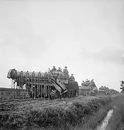 The regiment regained its combat status on 11 November 1940, when it became 2nd County of London Yeomanry (Westminster Dragoons) in the Royal Armoured Corps (RAC) – always known as simply the Westminster Dragoons.[3] The regiment joined the newly formed 30th Armoured Brigade in 11th Armoured Division on 8 March 1941. In May 1942 the brigade transferred to 42nd Armoured Division, and then in October 1943 to 79th Armoured Division under Major-General Percy Hobart. This division was equipping with specialist armour ('Hobart's Funnies') for the planned Allied invasion of Normandy (Operation Overlord), and 30th Armoured became the Flail tank brigade of the division.[40][41]