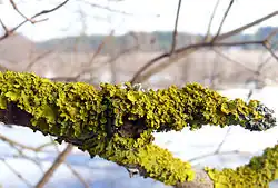 The lichen grows on a range of substrates and in diverse habitats. It is found in hardwood forests within broad, low-elevation valleys and occurs sporadically on Populus and other hardwoods in riparian zones of agricultural and populated areas.[35] It preferentially colonizes the upper parts of trunks (about 70% of total tree height), where the bark is younger and more exposed to sunlight.[74] It is also abundant on farm buildings and on rocks immediately above the high water mark in coastal zones, and on rocky seashores it typically forms a distinct band in the supralittoral zone between more halophilic species below and terrestrial species above.[75] Nutrient enrichment by bird droppings enhances the ability of X. parietina to grow on rock.[76] The species demonstrates substrate versatility and has even been recorded overgrowing lead on lead-incised gravestones in England.[77]