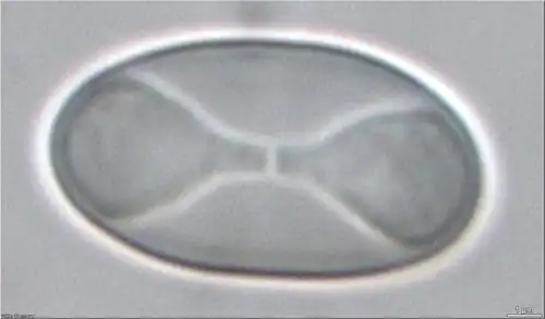 The ascospores made by X. parietina are hyaline (colorless and translucent), ellipsoid, and typically measure 13–16 by 7–9 μm. Like all Teloschistaceae lichens, they are polarilocular, meaning they are divided into two components (locules) separated by a central septum with a perforation. This septum ranges from 3 to 8 μm wide.[39]