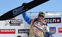 In 2010 he was nominated as a "stand out of the year" at 11th TransWorld SNOWboarding Rider Poll during SnowSports Industries America (SIA)'s Snow Show in Denver and 2010 Snowboarder Magazine Big Mountain Rider of The Year.[4][5][6] Furthermore, in March 2010, he won the Nissan Xtreme in Verbier with a new line, including a cliff that was never jumped before during this competition. With this victory, De Le Rue won the Freeride World Tour for the third time in a row.[7]