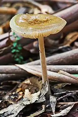The cap is 5 to 8 cm (2.0 to 3.1 in) in diameter, and brownish in color. The cap surface is moist, somewhat sticky, with conspicuous striations (grooves) at the margin. The gills have an adnate attachment to the stipe, are whitish in color, changing to buff in maturity, sometimes with a tinge of pink in older specimens. The whitish stipe is 8 to 11 cm (3.1 to 4.3 in) by 0.7 to 1.0 cm (0.3 to 0.4 in) thick, covered with small particles (furfuraceous) or small hairs (tomentose); the stipe bruises to a gray-tan color.[4] Like other Xerula species, X. australis has a characteristic root-like rhizomorph that extends down in the soil, usually attached to rotting wood under the fruitbody. The spore print is white.