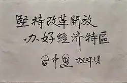 When he first arrived in Guangdong, he was told the provincial government had long been struggling to hold back the exodus of Chinese to Hong Kong since 1951.[60][61] At the time, daily wages in Guangdong averaged 0.70 yuan, about 1/100 of wages in Hong Kong.[61] Xi understood the disparity in standards of living and called for economic liberalisation in Guangdong.[61] When the Central Working Conference took place in Beijing from April 5 to 28, 1978, along with Yang Shangkun, who at the time was also a key Guangdong official, Xi told Deng Xiaoping that Guangdong should become a national demonstration zone for Reform and Opening Up.[62]: xvii In meetings in April 1979, Xi convinced Deng to permit Guangdong to make its own foreign trade policy decisions and to invite foreign investment to projects in experimental areas along the provincial border with Hong Kong and Macau and in Shantou, which has a large overseas diaspora.[63] As for the name of the experimental areas, Deng said, "let's call them, 'special zones', [after all, your] Shaanxi-Gansu Border Region began as a 'special zone'."[63] Deng added, "The Central Government has no funds, but we can give you some favorable policies." Borrowing a phrase from their guerrilla war days, Deng told Xi, "You have to find a way, to fight a bloody path out."[63] Xi submitted a formal proposal on the creation of special zones, later renamed special economic zones and in July 1979, the Central Committee and State Council approved the creation of the first four special economic zones in Shantou, Shenzhen, Zhuhai, Xiamen and Hainan.[61][63]