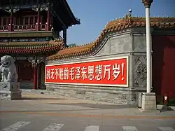 Around May or June 1967, the five red characters “Serve the People” were carved out of wood and pasted on the screen wall inside the Xinhua Gate; two slogans were carved out of wood, “Long Live the Great Chinese Communist Party !” and “Long Live the Invincible Mao Zedong Thought !” and pasted on the eight-character walls on both sides of the gate. Around 1970, the Zhongnanhai Restoration Department processed the five characters “Serve the People” and the two slogans on the screen wall of the Xinhua Gate, pasting gold foil on the five characters “Serve the People” to make them gold characters on a red background, and making the two slogans into plexiglass light boxes. Later, the two slogans were changed to white characters with gold foil borders. Mao Zedong wrote the five characters “Serve the People” many times after the founding of the People's Republic of China. The five characters on the screen wall of the Xinhua Gate are the best ones selected from the many scrolls written by Mao Zedong after the founding of the People's Republic of China.[3]