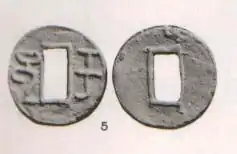 Among the earliest coins made in the Tarim Basin were the so-called "horse coins" of the "Yu Tian" kingdom near modern Hotan, also known as the "Sino-Kharosthi coins of Khotan".[1] These were struck around the second and third centuries with a horse image on one side and legends in Han (Chinese) and Kharosthi scripts.