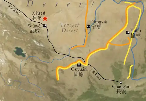 The city of Xiutu (休屠城), about 20 km (12 mi) north of Wuwei, has left monumental ruins (38°08′51″N 102°41′35″E / 38.147380°N 102.693031°E), located on the ancient border of Zhuye Lake.[7] After the conquests of Huo Qubing (121 BCE) the city would be incorporated just inside of the Great Wall built under the Han dynasty.[7] The Minqin Basin along the Shiyang River was named "Xiutuze" (休屠泽, "Lake Xiutu") after the King.[12][13]