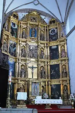 The church interior conserves its original 16th-century main altar, with four stories tall, contains indigenous, Italian, Flemish and Spanish influence and is covered in 24karat gold leaf.[55] It contains a relief of San Bernardino surrounded by two groups of indigenous sculptures, who are helping to build the church. Above San Bernardino, there is a depiction of the Virgin of the Assumption and the Virgin of Xochimilco. The paintings represent episodes from the life of Jesus and have been attributed to Simon Pereyns and Andrés de la Concha.[44] This is one of the few 16th-century altarpieces to have survived and the only one similar to it in size and construction is located in the monastery in Huejotzingo, Puebla.[56]