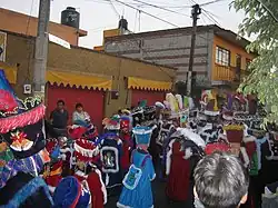 These mostly religious festivals and other traditions have been maintain despite the urbanization of the borough. The calendar of celebrations here is extensive. Some are civic or political events such as Independence Day or local celebrations such as the birth of poet Fernando Celada, the birth of Quirino Mendoza y Cortés, composer of “Cielito Lindo,” and the commemoration of the meeting of Francisco Villa and Emiliano Zapata on December 4 in this area. However, most events are tied to religious activity and tradition, organized by volunteers called mayordomos.[48] The mayordomia system is the most important social structure in the borough. The primary task of these volunteers is to sponsor and organized any many religious festivals and celebrations that occur through the year, as well as other duties. This may be paid for by collecting donations or paid for directly by the mayordomo.[5][47] There are 422 officially recognized festivals during the year,[5] including those local to specific communities.[41] One of these more localized festivals is on May 3, Day of the Holy Cross, which has been celebrated in communities such as Santa Cruz Xochitepec (or Magdalena Xochitepec), Santa Cruz Acalpixcan and the center of Xochimilco for over 400 years.[49]