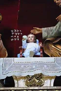 However, the best known mayordomo position is not for a festival, but rather for the care of an image of the child Jesus called the Niñopa.[48] The image is over 435 years old and has a following of about 25,000 in the Xochimilco area.[50] It measures 51 cm (20 in) and weighs less than a kilo.[51] The name “Niñopa” comes from the Spanish word “niño” (child) and the Nahuatl suffix “-pan” (place) to mean “child of the place.”[7] The image was thought to have been made of orange tree wood, but this was proven false when the image was dropped and a finger damaged, allowing for the taking of a small sample. The analysis showed that it was made in the local area of a tree called a chocolín, in the 16th or 17th century.[52] The prestige for becoming a mayordomo for the Niñopa is so great, that the waiting time to become one is decades long.[42][48][52] The mayordomo receives nothing for the care of the image and pays all expenses out of pocket, which includes building rooms for the image to stay, and sponsoring the nearly daily events dedicated to this image.[5] The annual cycle begin on February 2, when the image is received by a new mayordomo. During the year, the image visits homes and hospitals, accompanied by Chinelos dancers.[7] In addition to the Niñopan, other important child Jesus figures include the Niño Dormidito in the Xaltocan neighborhood, the Niño de Belen at the Salitre Embarcadero, the Niño Tamalerito, and the Niño de San Juan. These images, along with the Niñopan, are celebrated together on April 30, at an event called the Niños Sagrados.[42] There are various replicas of the Niñopa, which are owned by former mayordomos.[52]