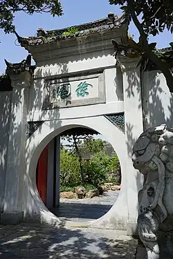 The entrance to Xu Garden, its name written right to left in the archaic style and guarded by a foo dog