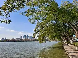 Spanning approximately 444 hectares with a 15 km shoreline, Xuanwu Lake encompasses five islets interconnected by arch bridges.[7] Eutrophication became a major issue in the 1980s–2000s. Large-scale sediment dredging, algal bloom control, and vegetation planting efforts in 2009 and 2014 have notably improved water quality.[8][9] Recent surveys indicate further improvement, though nutrient management remains crucial.[10]