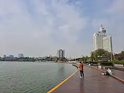 Within the scenic park are pagodas, pavilions, tea houses, and restaurants. Entertainment options include boating, zoo, and an outdoor theatre.[4] Key attractions include the Nuo'na tower, Lama Temple, cenotaph of Guo Pu, and the Rose Garden. On the lake are boats and ferries. It is also considered the "Pearl of the Stone City".[3] If desired, a visitor could stroll through the park for up to five hours.[11]