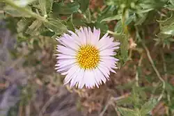 The inflorescence is a solitary flower head with up to 30 or more pale lavender to pale violet rays surrounding a yellow central disk. Each petal may measure over 2 centimeters in length. The flowering period is January to June.[5]