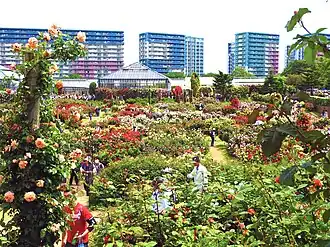 Yachiyo is located inland in northwestern Chiba Prefecture on the Shimōsa Plateau,[2] about 13 kilometers from the prefectural capital at Chiba and 33 kilometers from central Tokyo. The Shin River, 10 kilometers (6.2 mi) in length, flows through Yachiyo and forms the upper part of the Inba Discharge Channel.[3] Pollution was once problematic along the river caused by phosphorus, potassium, and nitrogen draining from vegetable farms along the length of the river.[4] A 19 kilometers (12 mi) walking path was built by the city of Yachiyo, and features a pedestrian suspension bridge with an observation platform.[5]