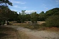 The Nara area bears many memorials to the Yagyū family, and their family graveyard lies on the grounds of the Hōtoku-ji where the clan's main bastion Yagyū Castle was.[1] On the grounds is a rock called Ittō-seki, which Muneyoshi is supposed to have cut in half with his sword (but was probably split by lightning).