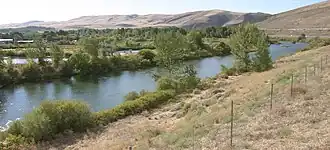 The Yakima River is a tributary of the Columbia River in south central and eastern Washington state, named for the indigenous Yakama people. Lewis and Clark mention in their journals that the Chin-nâm pam (or the Lower Snake River Chamnapam Nation) called the river Tâpe têtt[6] (also rendered Tapteete),[7] possibly from the French tape-tête, meaning "head hit". The length of the river from headwaters to mouth is 214 miles (344 km), with an average drop of 9.85 feet per mile (1.866 m/km). It is the longest river entirely in Washington state.