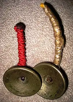 The Yakshagana bells (Kannada: ಯಕ್ಷಗಾನ ತಾಳಗಳು) or Yakshagana cymbal are a pair of finger bells made of a special alloy (traditional five metal) used in Yakshagana (Badagu Thittu). They are used by the singer to keep the tempo and rhythm of Yakshagana performances. The pitch of the bells are generally very high and do not match the pitch of the singer; as such, singers may use bells of any key.
