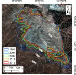 Due to its relative accessibility, the glacier is one of the most studied in Nepal, starting with Japanese glaciologists.[2] Researchers have found that the glacier rapidly retreated since the 1990s.[5] Since 1974 the surface area of the glacier dropped 66% and the glacier retreated 784 meters.[6]