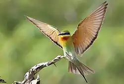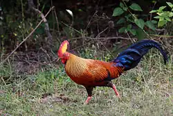 Yala is one of the 70 Important Bird Areas (IBAs) in Sri Lanka.[10] Of 215 bird species of the park, seven are endemic to Sri Lanka.[2] They are Sri Lanka grey hornbill, Sri Lanka junglefowl, Sri Lanka wood pigeon, crimson-fronted barbet, black-capped bulbul, blue-tailed bee-eater and brown-capped babbler. The number of waterbirds inhabiting wetlands of Yala is 90 and half of them are migrants.[3] Waterfowl (lesser whistling duck, garganey), cormorants (little cormorant, Indian cormorant), large waterbirds (grey heron, black-headed ibis, Eurasian spoonbill, Asian openbill, painted stork), medium-sized waders Tringa spp., and small waders Charadrius spp. are among the most common waterbirds. Black-necked stork and lesser adjutant are many of the rare birds that can be seen in the park. The migrant great white pelican and resident spot-billed pelican are also have been recorded. Other waterbirds attracted to the Yala lagoons include lesser flamingo, pelicans, and rare species such as purple heron, night herons, egrets, purple swamphen, and Oriental darter. Thousands of waterfowls migrate to the lagoons of Yala during the northeast monsoon. They are northern pintail, white-winged tern, Eurasian curlew, Eurasian whimbrel, godwits, and ruddy turnstone. The visiting species mingled with residing lesser whistling duck, yellow-wattled lapwing, red-wattled lapwing, and great stone-curlew. Rock pigeon, barred buttonquail, Indian peafowl, black stork, black-winged stilt, and greater flamingo are among the other bird species. Crested serpent eagle and white-bellied sea eagle are the raptors of the park. The forest birds are orange-breasted green pigeon, hornbills, Old World flycatchers, Indian paradise flycatcher, Asian barbets, and orioles.[9]