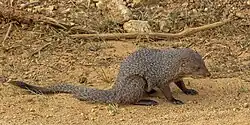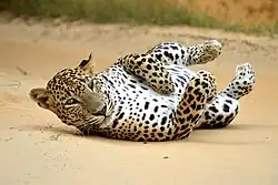 Including Sri Lankan elephant, 44 species of mammals are resident in Yala National Park,[2] and it has one of the highest leopard densities in the world.[11] 25 individual leopards are estimated to roam in Block I.[12] The elephant herd of Yala contains 300–350 individuals.[13] The Sri Lankan sloth bear, leopard, elephant, and wild water buffalo are all threatened mammals that Yala harbours. Although water buffaloes are indigenous to Sri Lanka, most populations contain genes of the domestic stock or have descended from feral populations. Toque macaque, golden palm civet, red slender loris, and fishing cat are among the other mammals that can be seen in Yala. The elephant population of the park varies seasonally.[9]