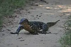 The reptile fauna recorded from the park is 47 and six of them are endemic. Sri Lankan krait, Boulenger's keelback, Sri Lankan flying snake, painted-lip lizard, Wiegmann's agama, and Bahir's fan-throated lizard are the endemic species.[2][14] The coastal line of the park is visited by the all five globally endangered sea turtles (leatherback turtle, olive ridley, loggerhead sea turtle, hawksbill turtle, and green turtle) that visit Sri Lanka.[2][3] The two breeding crocodile species of Sri Lanka, mugger crocodile and saltwater crocodile, inhabit the park. The Indian cobra and Russell's viper are among the other reptiles.[9]