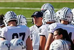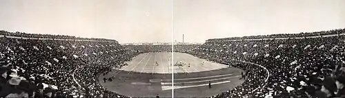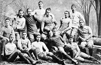 The Bulldogs were the dominant team in the early days of intercollegiate football, winning 27 college football national championships, including 26 in 38 years between 1872 and 1909.[3] Walter Camp, known as the "Father of Football", graduated from Hopkins Grammar School in 1876, and played college football at Yale College from 1876 to 1882. He later served as the head football coach at Yale from 1888 to 1892.[4] It was Camp who pioneered the fundamental transition of American football from rugby when in 1880, he succeeded in convincing the Intercollegiate Football Association to discontinue the rugby "scrum", and instead have players line up along a "line of scrimmage" for individual plays, which begin with the snap of the ball and conclude with the tackling of the ballcarrier.[5] In 1916, against the advisement of coach Tad Jones, Yale quarterback Chester J. LaRoche (1918s) helped lead the Yale team in a win against Princeton by turning the momentum of the game with a fourth-down call in the huddle to go for first down rather than punt. The team made the down and went on to win the game in one of Yale's greatest victories in its history. LaRoche went on to spearhead the creation of the National Football Foundation and Hall of Fame.[6]