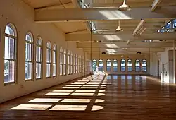 The original building's main floor has vaulted ceilings, large windows, brick walls, a flat roof, and wooden cross beams. The mezzanine consists of three rooms. The second floor has large windows and vaulted ceilings, restrooms, and a lunchroom. Stairs and elevators connect the levels, including the basement and its boiler room. A lobby and office in the southwest corner of the main floor can be entered from inside or via the original main door off Southeast 10th Avenue.[1]