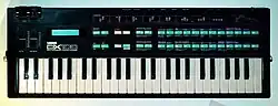 The Yamaha DX100 is an FM synthesizer released by Yamaha in 1986.[4][5][6] It offers four operators for each of its eight voices, and has eight algorithms (compared to the DX7's six operators for each of its sixteen voices, and thirty-two algorithms). It has only 49 mini-keys, and no arpeggiator or effects, but is still useful, known in particular for its bass patch #1. It features up to 192 presets, seriously improving the DX7's limited preset capabilities. It can also store 24 user-programmable sounds in RAM. It lacks cartridge support, but voice patches can be saved to and loaded from an external cassette recorder.