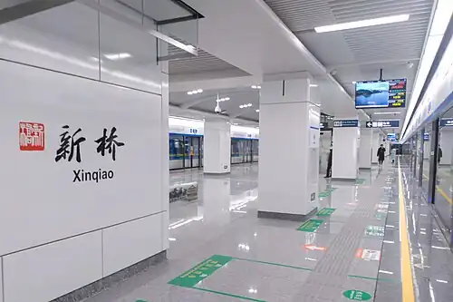 Platform of Yangbeihu Station, with the name "Xinqiao". The station has changed its name in April 2021.