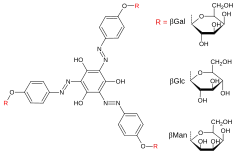 Yariv reagent (1,3,5-tri(p-glycosyloxyphenylazo)-2,4,6-trihydroxybenzene) is a glycosylated phenolic compound that binds strongly to galactans and arabinogalactan proteins.[1][2][3] It can therefore be used in their detection, quantification, precipitation, isolation, staining, and interfere with their function.[3][4] It was initially synthesised in 1962 as an antigen for carbohydrate-binding antibodies but has subsequently become more broadly used.[1][5] There are many variants of Yariv reagents which vary in the glycosyl groups on the outside of the structure, typically glucose, galactose, and mannose.[6]