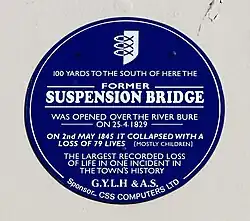 Yarmouth suspension bridge spanned the River Bure at Great Yarmouth, Norfolk from 1829 until its collapse in 1845. The bridge was widened in 1832, which had not been anticipated by the original design. On 2 May 1845, the bridge collapsed under load from a crowd who had gathered to watch a circus stunt on the river. Some 79 people, mainly children, were killed. An investigation found fault with the design and quality of the bridge. A modern-day memorial marks the site of the disaster.
