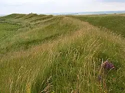 Yarnbury Castle is the site of a multiphase, multivallate Iron Age hillfort near the village of Steeple Langford, Wiltshire, England. The site covers an area of 28.5 acres (11.5 ha), and was extensively surveyed and investigated by the Royal Commission on the Historical Monuments of England in 1991, with finds of Iron Age and Romano-British pottery, Iron Age and Roman coins, and burials of human remains. There is much evidence of prolonged and extensive settlement of the site, including evidence of around 130 structures of various sizes, most probably representing a mix of round houses, pits, and other features.[2] It was designated as a scheduled monument in 1925.[3]