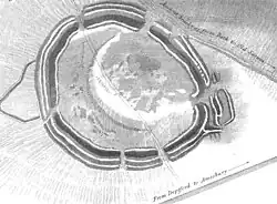 The Winterbourne Stoke sheep fair was held on the site from the 18th century until 1916, when the area was commandeered by the British Army. There are several prominent features associated with this former use, including several sheep folds to the south eastern corner of the hillfort. These are grouped in two blocks of 8, with low mounded earthworks clearly visible and covering an area of 120 m (390 ft) by 90 m (300 ft).[2] They do not however appear in Sir Richard Colt Hoares pencil sketch of the site from 1810, indicating that these date from later in the 19th century.