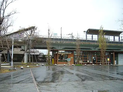 The station consists of an island platform serving two elevated tracks. There is no station building only a shelter on the platform for waiting passengers. Benches are also provided on a paved area under the elevated structure as a form of waiting area. Access to the platform is by a flight of steps or an elevator. A designated parking area for bicycles is provided underneath the elevated structure.[2][3][5]