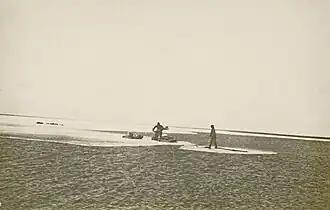 ![]() A black and white image of two men at Yathkyed Lake using Ice floes as Ferry boats. The date is 1924. | |