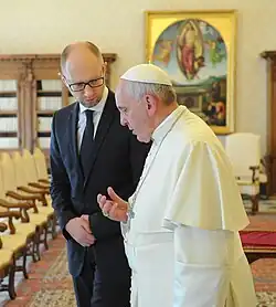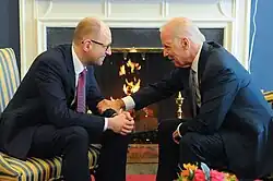 Arseniy Petrovych Yatsenyuk[a][b] (born 22 May 1974) is a Ukrainian politician, economist and lawyer who served two terms as Prime Minister of Ukraine – from 27 February 2014 to 27 November 2014 and from 27 November 2014 to 14 April 2016.[1] He was the youngest foreign affairs minister in Ukraine's history. Arseniy Yatsenyuk holds a diplomatic rank of Extraordinary and Plenipotentiary Ambassador.[2]