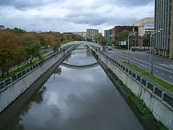 The railroad infrastructure in Krasnoselsky District, a steady source of municipal revenue,[30] was threatened by regular floods on numerous tributaries of the Yauza.[31] This risk, along with the drive to free up land for development, led to the first modern flood control measures in the Yauza basin. Red Pond (55°45′37″N 37°40′36″E / 55.76028°N 37.67667°E), connected to the Yauza by the Chechora River, was drained and converted to municipal rail yards in 1900–1911.[32] During the same period, the Chechora was diverted into an underground sewer[31] and the Yauza was spanned by new bridges.[33]
