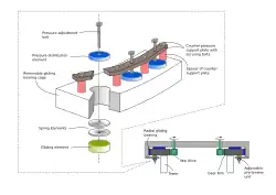 When the wind turbine nacelle is positioned on the tower and the yaw bearing assembly is completed it is necessary to adjust the pressure on the individual gliding pads of the bearing. This is necessary in order to avoid un-even wear of the gliding pads and excessive loading on some sectors of the yaw bearing. In order to achieve that, an adjustment mechanism is necessary, which enables the technicians to adjust the contact pressure of each individual gliding element in a controllable and secure way. The most common solution is the utilization of bottom bearing plates equipped with large opening, which accommodate the adjustable gliding bearing systems. These adjustable gliding bearings comprise a gliding unit (i.e. gliding pad) and an adjustable pressure distribution plate. In between the gliding pad and the pressure plate several spring (pre-tension) elements are located. The vertical position of the pressure plates is usually controlled by an adjustment screw. This adjustment screw presses against the pressure plate while being retained by a counter-pressure support plate, fixed on the bearing assembly with strong bolts. In this way it is possible to apply various levels of contact pressure among the different gliding pads and therefore to ensure that each gliding component of the yaw bearing arrangement is performing as anticipated.