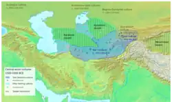 The Yaz culture (named after the type site Yaz-Tappe, Yaz Tepe, or Yaz Depe, near Baýramaly, Turkmenistan[1]) was an early Iron Age culture of Margiana, Bactria and Sogdia (c. 1500–500 BC,[2][3][4][5][6][7][8] or c. 1500–330 BC[9][10]). It emerges at the top of late Bronze Age sites (BMAC), sometimes as mud-brick platforms and sizeable houses associated with irrigation systems. Ceramics were mostly hand-made, but there was increasing use of wheel-thrown ware. Bronze and iron arrowheads, also iron sickles and carpet knives among other artifacts have been found.[11][12][13]